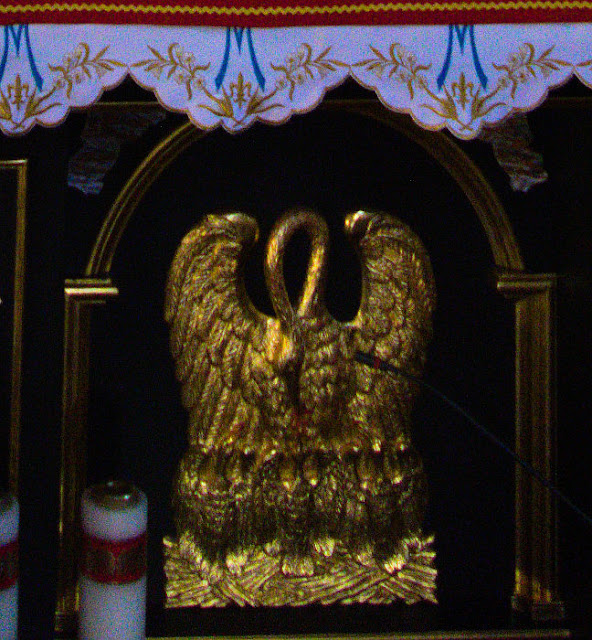 Wyżej w ołtarzu i niżej nad baldachimem ambony rzeźba pelikana karmiącego swoje pisklęta. Przedstawienie pelikana karmiącego swoje młode, to częsty motyw sztuki sakralnej, nie jest czymś niezwykłym. Wręcz przeciwnie, to jedno z najstarszych wyobrażeń ikonografii chrześcijańskiej i zarazem jeden z ulubionych motywów zwierzęcych w sztuce chrześcijańskiej. Inne tego typu motywy to jagnię, mityczny feniks (powstający z popiołów, symbol Zmartwychwstania Chrystusa) oraz jednorożec (według legendy, może go pochwycić jedynie dziewica, stąd jest alegorią Wcielenia).