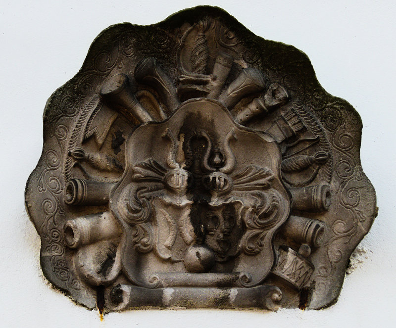 Na ścianie kilka herbów rodowych. Tu hr. Adam Sigmund von Unruh