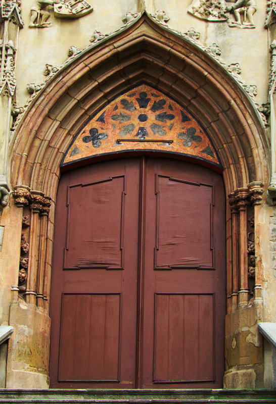 Ostrołukowe, uskokowe ościeża portalu wspierają się na bogato rzeźbionych konsolach, o roślinnych motywach